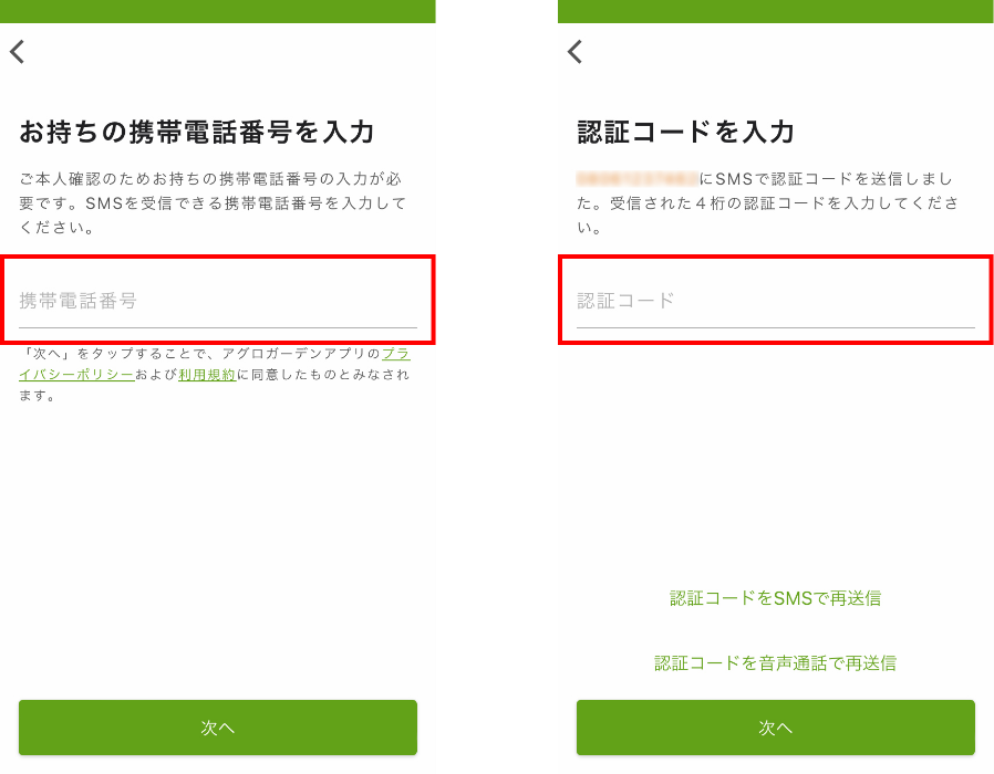 入力後「次へ」をタップすると認証コードがSMSで送られてきます。送られてきた4桁の認証コードを入力してください。
