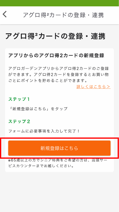 アグロ得²カード シニア会員のご登録はお近くのアグロガーデン店頭サービスカウンターへお越しください。 アグロ得²カード シニア会員をもっと詳しく